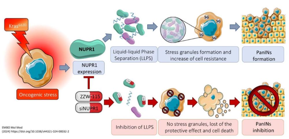 Les résultats les plus récents de nos travaux ont montré que ZZW-115 inhibe la formation des granules de stress dépendants de NUPR1, freinant ainsi la progression des néoplasies intraépithéliales pancréatiques (PanINs) chez des souris porteuses de la mutation oncogénique KrasG12D. Cette inhibition a conduit à la mort cellulaire, à l'activation de la caspase 3, à la fragmentation de l'ADN et à la formation de corps apoptotiques après un traitement de quatre semaines.