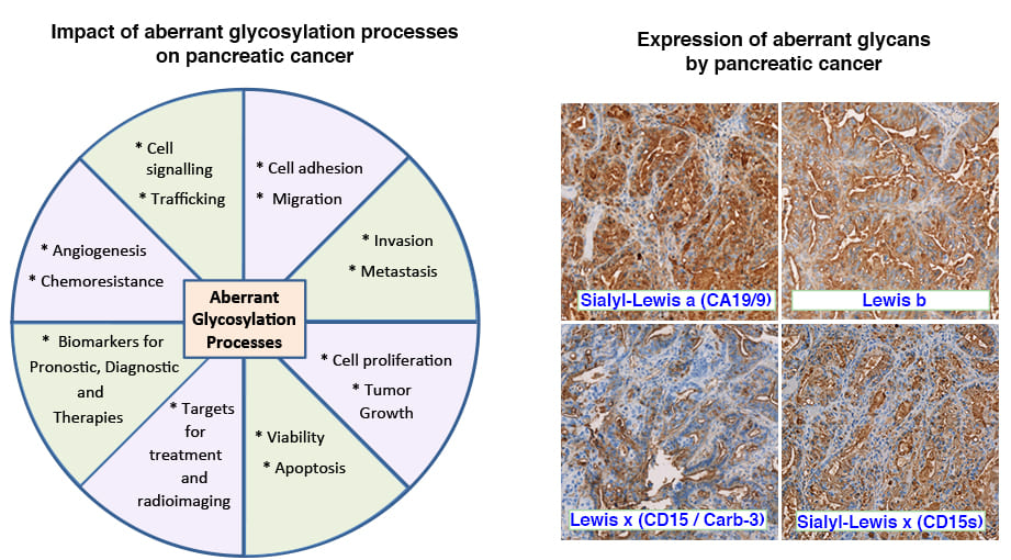 Ces structures peuvent être générées sur les glycoprotéines et les glycosphingolipides suite à une altération profonde, entre autres, de l’expression des enzymes de la glycosylation, telles que les glycosyltransférases. Ces glycanes aberrants contribuent ainsi fortement à cette hétérogénéité tumorale et peuvent participer à la transformation maligne, la progression tumorale et la dissémination métastatique.