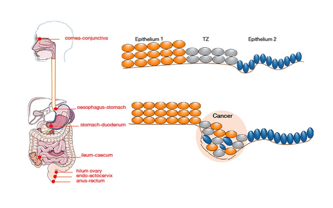 Transition zones represent an abrupt transition between two types of epithelium and are found in many areas of the body, such as between the esophagus and stomach, at the cervix and between the anal canal and rectum. These regions are prone to develop frequent cancers with a very poor prognosis in humans and mice, presenting a strong metastatic tendency. This makes the study of these areas particularly interesting.